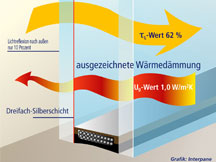 Eine neu entwickelte Dreifach-Silberschicht auf der Innenoberfläche der äußeren Scheibe ermöglicht einen Technologie-Sprung: Lichtdurchlässigkeit (TL) 62 Prozent, g-Wert 29 Prozent – eine Selektivität höher als Faktor 2. Diese für farbneutrale Sonnenschutzgläser herausragenden Werte erreicht jetzt das neue ipasol ultraselect 62/29 von Interpane (Lauenförde).
