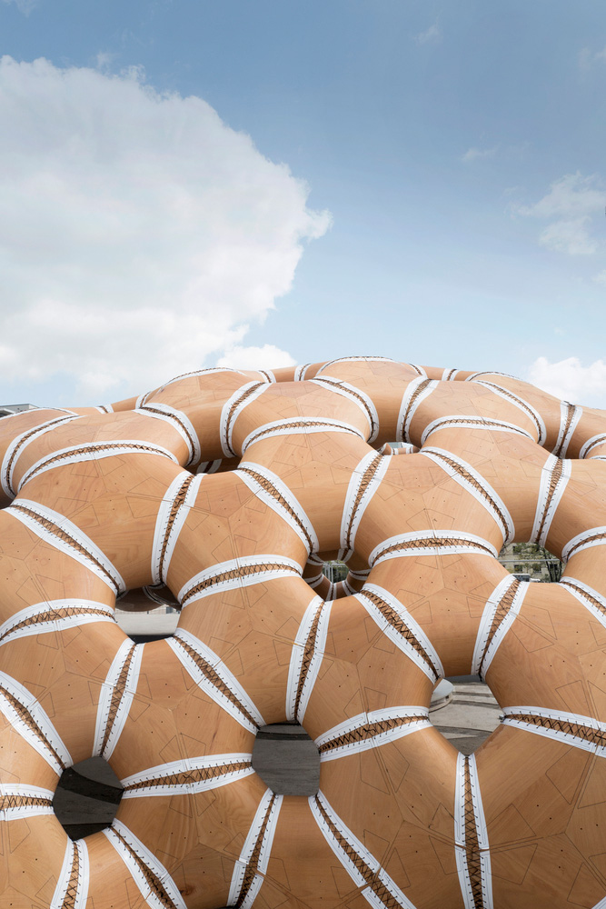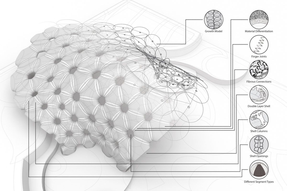 Als biologisches Vorbild diente dabei der Sanddollar (Clypeasteroida), ein Seeigelart, dessen zweiwandiger Schale dem Meeresbewohner eine enorme Stabilität bei gleichzeitig geringem Gewicht verleiht. Auch einige weitere Details wurden beim Sanddollar abgeschaut, wie z.B. eine Keilzinkenverbindung zwischen den Plattenelementen, die tragende Säulenstruktur und die Konstruktion um Öffnungen zwischen den Segmenten.