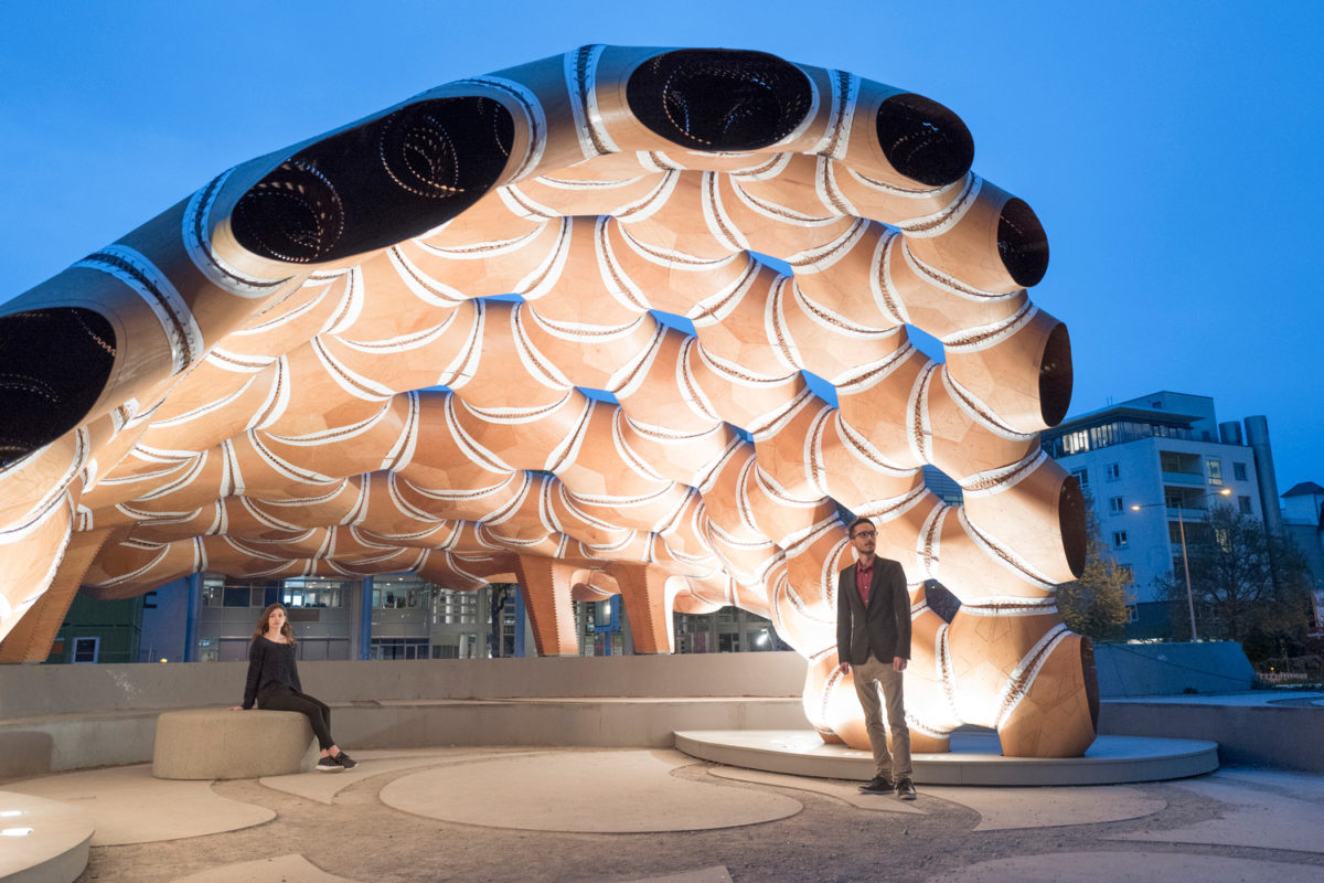 Und wieder einmal gelang es dem Institute for Computational Design (ICD) und dem Institute of Building Structures and Structural Design (ITKE) der Universität Stuttgart einen Forschungspavilion zu errichten, der angenomme Grenzen überschreitet und der Architektur eine ganz neue Tür öffnet. Zum ersten mal wird hier das Nähen von Holzelementen auf einen architektonischen Maßstab skaliert.