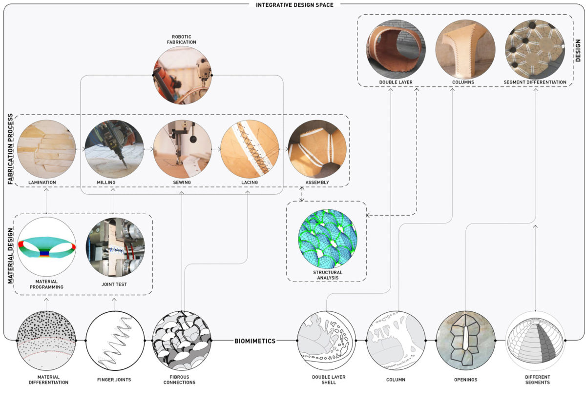 Unter Leitung von Prof. Achim Menges (ICD) und Prof. Jan Knippers (ITKE) forschten und gestalteten Mitarbeiter und Studenten in einem interdisziplinärem Team aus Architekten, Ingenieuren, Biologen und Paläontologen. Der diesjährige research pavilion basiert auf Untersuchungen von natürlichen, segmentierten Plattenstrukturen und einem neuartigen, robotorgestützten Fertigungsprozess, der dünne Sperrholzlagen zusammennäht.