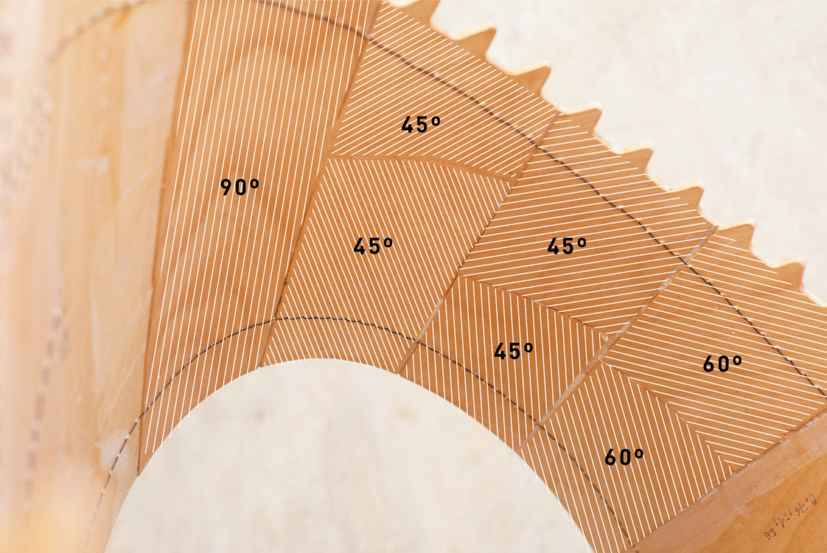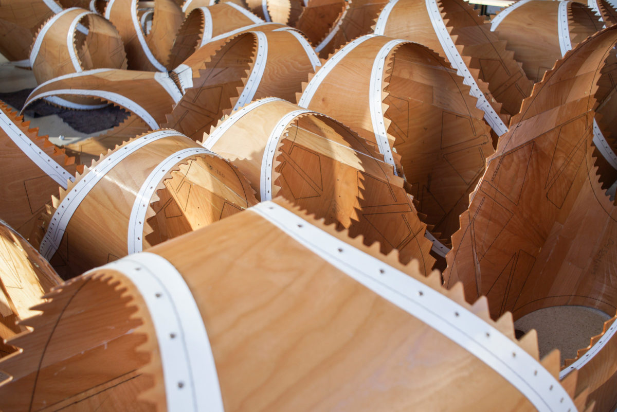 Das Konstrukt ist aus 151 unterschiedlichen Segmenten zusammengesetzt, die zwischen zwei Wänden einen Hohlraum aufmachen. Die dünnen Sperrholzplatten werden ganz individuell zusammengeleimt, wodurch sie je nach Anforderung verschieden elastische Eigenschaften erhalten. Mittels eines computergesteuerten Robotorarms und einer Industrienähmaschine werden die flachen Platten zunächst zu einem zweiwandigen Element zusammengenäht. Im zweiten Schritt wird eine mit Ösen versehende PVC-Folie aufgenäht, durch die dann später ein Strick gefädelt wird und die Verbindung zwischen den Elementen darstellt.