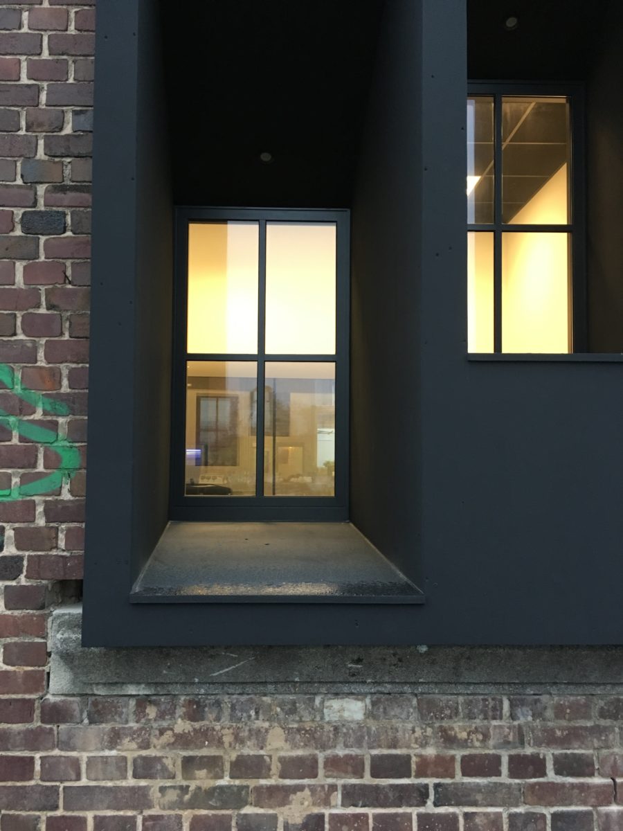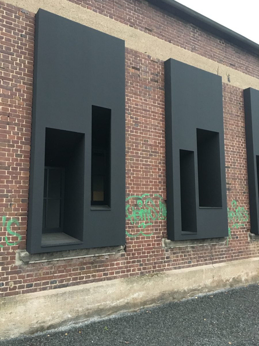 Die schwarz Kästen sind aus Holzplatten zusammengeschraubt und in die tiefen Laibungen eingestellt. In der hinteren Ebene sitzen neue Fenster auf unterschiedlichen Höhen.