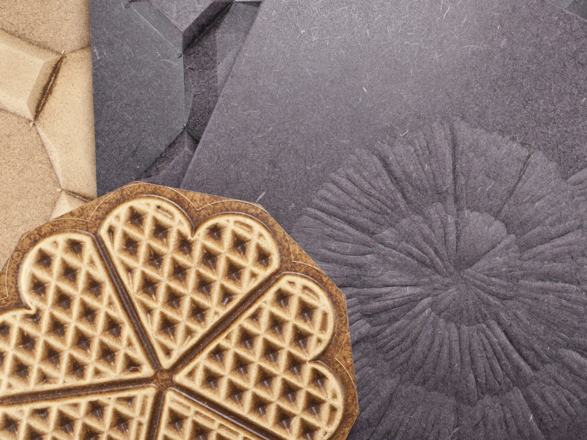 Beim Anblick dieser Muster läuft einem das Wasser im Mund zusammen und man möchte direkt zubeißen. Normalerweise hinterlassen die beiden heißen Eisen des Waffeleisens auf dem darin gebackenen Feingebäck ihre typische Rautenstruktur. In diesem Fall wurde aber nicht Mehl und Wasser zu einer knusprigen Delikatesse verarbeitet, sondern eine neue Rezeptur für Holzwerkstoffe.